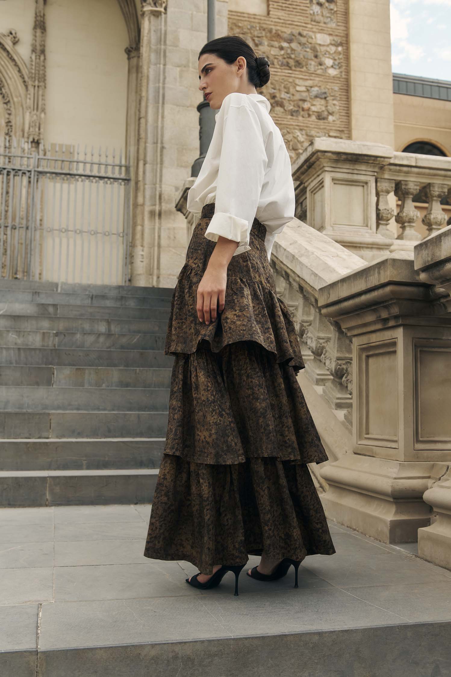 Falda Luisa, confeccionada en suave viscosa, destaca por sus elegantes volantes que aportan frescura y movimiento a tu estilo. Perfecta para cualquier ocasión, combínala con una camisa blanca o satinada y consigue un look sofisticado y lleno de personalidad. Ideal para quienes buscan comodidad sin renunciar a la elegancia.