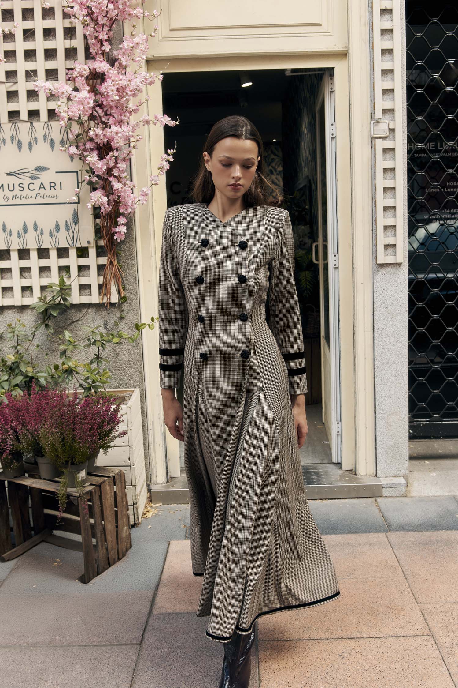 Este vestido de vuelo con botones delanteros y hombreras está diseñado para resaltar tu figura ajustándose a la cintura. Su estilo versátil te permite combinarlo con tacones para eventos de invierno o con botas para un look perfecto en la oficina. Elegancia y comodidad en una sola prenda para cualquier ocasión.